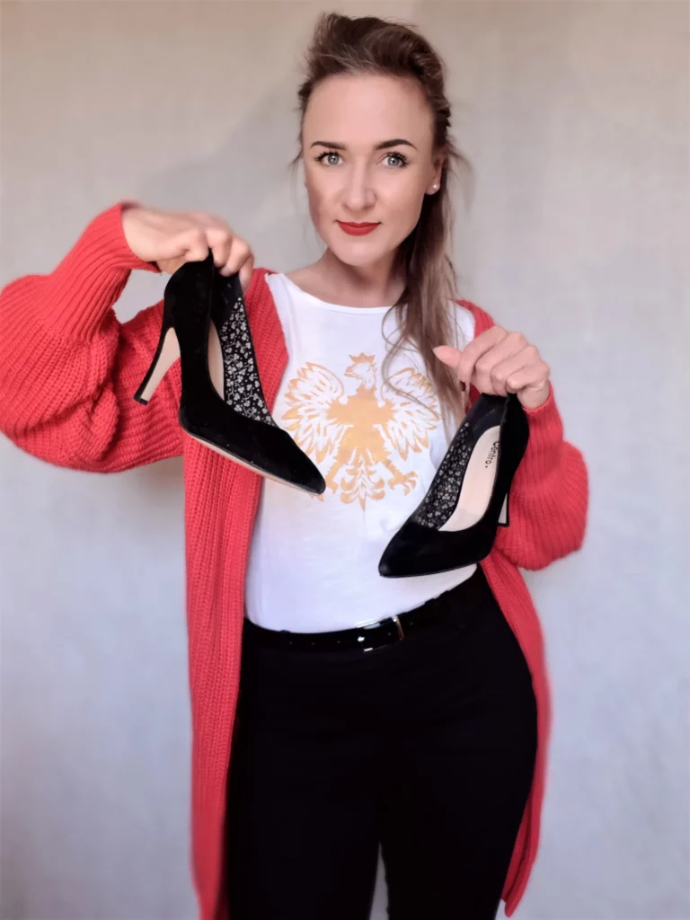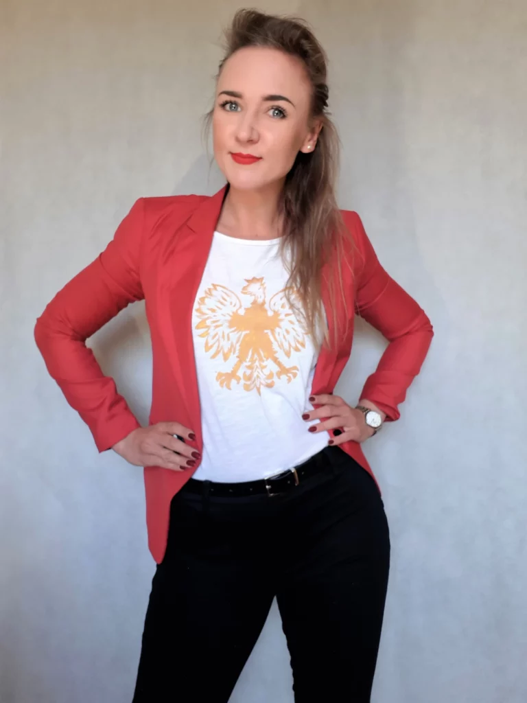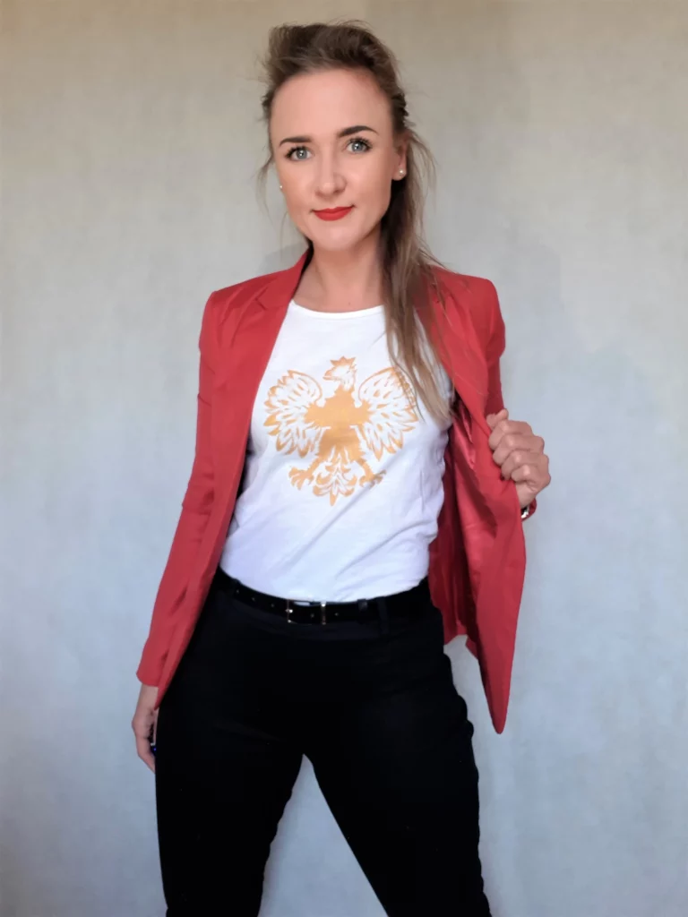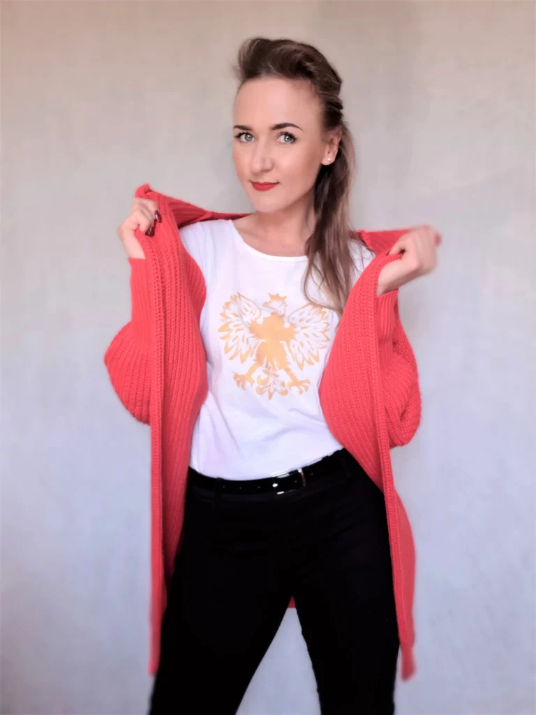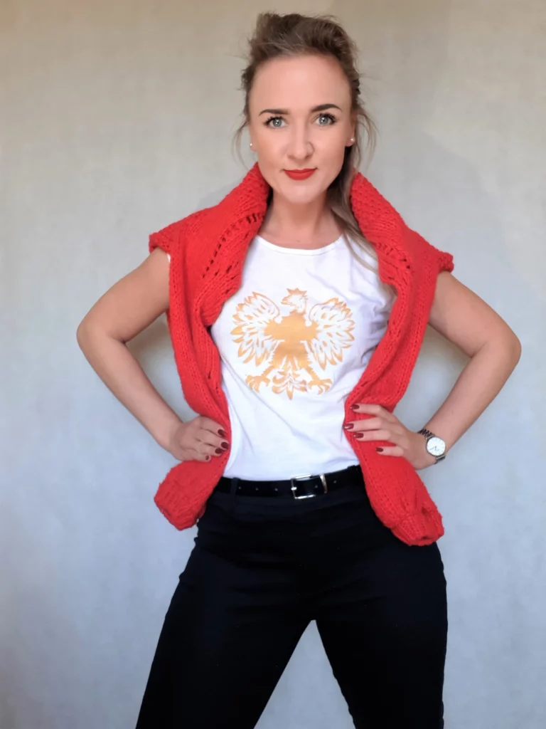 Stylizacja biało-czerwona z czarnymi dodatkami. Oczywiste zestawienie kolorów – nie banalne rozwiązanie. Do stylizacji ubrałam t-shirt na którym namalowałam złotą farbą orła z naszego Godła Polski – ciekawy atrybut, który wyróżnia oraz nadaje stylizacji oryginalności. Lubisz elegancję? Ubierz marynarkę, białą koszulę i czarne lub czerwone szpilki. Wolisz wygodny, casualowy styl? Załóż biały t-shirt z nadrukiem lub bez, a do tego czarne baleriny/trampki. Do całości dobierz czerwony oversizowy sweter bądź kardigan, który świetnie pokaże całość stylizacji. Kombinacji tego outfit-u jest wiele, zależy co posiadasz w swojej garderobie.